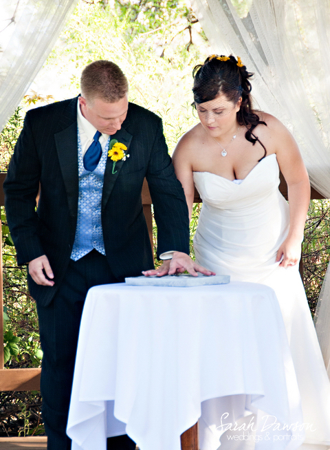 Brian and Jen held hands and imprinted them into a clay tablet inscribed with their names and the date of their marriage.